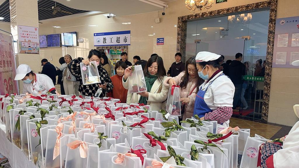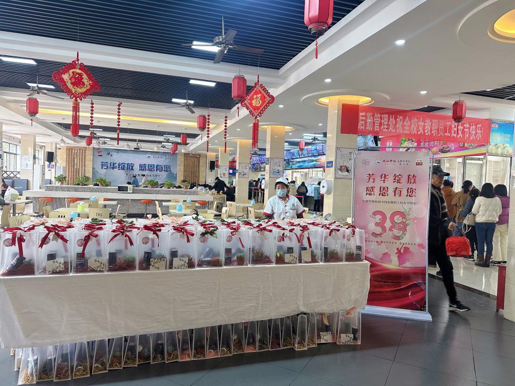 为庆祝第115个"三八"国际劳动妇女节,九江学院后勤管理处联合校工会在食堂开展“芳华绽放感恩有您”主题活动,为节日期间坚守岗位的女教职员工送上节日祝福与暖心福利,传递校园温情。