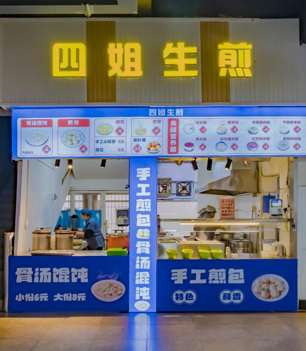 生煎包在平底锅里滋滋作响,逐渐开始变得金黄;底部的脆皮像一层薄纱,透着诱人的光泽,咬下去“嘎吱”一声,满口留香。这是“四姐生煎”的招牌美食之一,每一口都是时间与匠心的结晶。