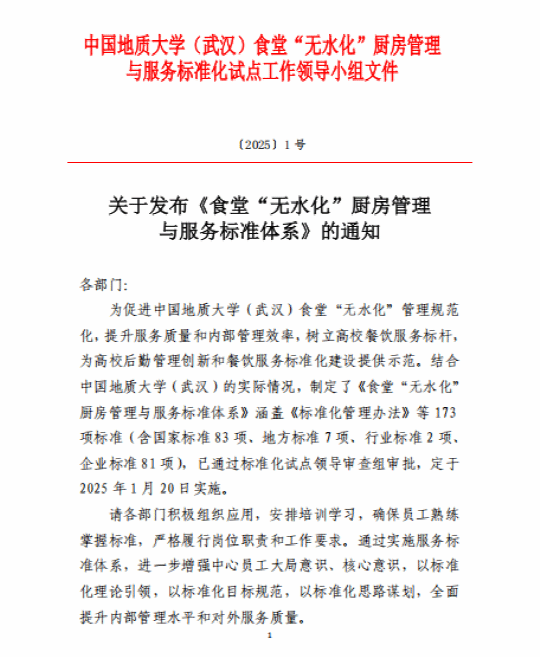 经专班多轮研讨,领导小组严格审核,《食堂“无水化”厨房管理与服务标准体系》于2025年1月20日以红头文件形式正式发布,标志着我校后勤饮食管理迈入标准化新阶段。