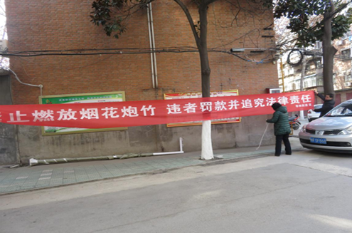(社区科正在悬挂禁止燃放烟花炮竹的条幅)