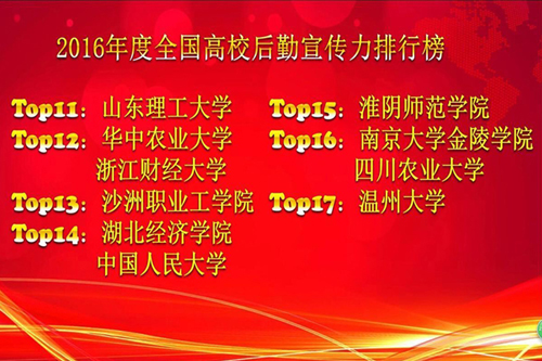 中国教育后勤协会为总结经验,鼓励先进,树立典型,推进信息宣传工作再上新台阶,经各省级学校后勤协会(研究会)推荐或各高校后勤管理部门和服务实体自荐,中国教育后勤协会评选,发布了“2016年度全国高校后勤宣传力排行榜”TOP1至TOP20,表彰了全国70个单位为全国教育后勤系统信息宣传工作先进单位。