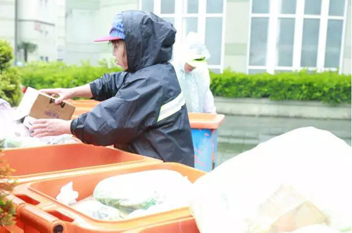 狂风肆虐还夹杂着密集的雨的早晨,当我们走到本部公寓垃圾场时,发现早有一个身影在风雨中的这个狭小的区域内,挥动着扫把进行着辛苦的清洁工作。