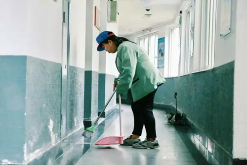 我们来到了本部公寓9#,看到早已开始日常工作的魏阿姨。她是负责楼内卫生的清洁工,本部公寓几乎每一幢楼的清洁阿姨都要一个人负责至少一栋楼,按楼层来计算就是9层楼,负责的内容包括清垃圾、拖地、擦窗、除尘...想到打扫一间寝室都有点吃力的自己,真的很难相信这么多的工作要在一天之内,一个早上做完。