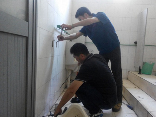 常熟理工学院后勤保障部总经理凌正飞带领党员们深入东南校区学生宿舍,详细了解了宿舍区热水供应、洗衣房的使用、晾衣架的配置、公共区域卫生保洁等情况,并与学生进行交谈,倾听他们对后勤保障服务的意见与建议。同时,东湖学生宿舍区,假日里安静的校园内,多了一行忙碌穿梭在各个组团的身影,他们是由后勤保障部党总支书记沈亚林带队的党员们正深入宿舍区进行假期现场水电集中维修服务。17-18号学生宿舍组团内,党员赵建国扛着一架人字梯爬上了6楼的宿舍,为学生修理顶灯与电风扇,灯光闪亮瞬间,已然看见赵师傅额上细细的汗珠。5-6号学生宿舍组团内,党员沈建平和黄健两位师傅正热火朝天地修理着厕所内阻塞的小便池与下水道,他们不怕脏累,身上溅满了脏水与污迹,也顾不上擦一下。管道疏通的那一刻,师傅们脸上露出了质朴的笑容。师傅们优质的服务如同夏日里一袭清凉的风,舒爽了每一位学生的心。