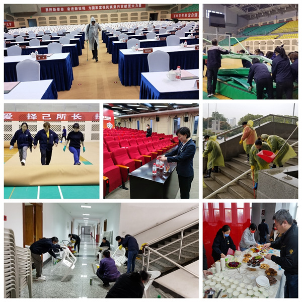物业服务中心在校庆期间重点做好图书馆、体育馆的物业服务保障工作。场馆项目部、图书馆项目部积极与学校相关单位沟通、协调相关事宜,落实保障人员,明确工作职责,提前对会场、贵宾室等重要场所的设施设备及广场设施进行全面排查报修。现场工作责任到人、全力以赴、加班加点,做好从场地布置到会场消毒及外围车辆管理等工作。