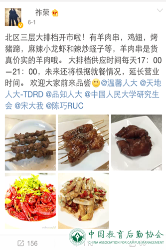为此,他带领北区食堂团队商讨在北区三层开设“烧烤”档口的可行性。紧接着,紧锣密鼓的考察、试做、试吃等准备工作接连开展。直到 6月初,北区食堂三层开启了“烧烤”模式,这一消息引爆了校园,大批学生专门到学校食堂撸串。