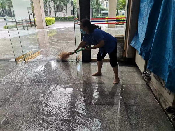 保洁人员正在211大楼排水