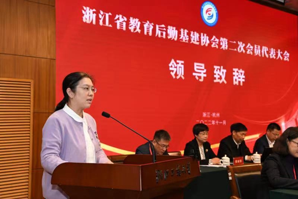 白红霞代表浙江省教育厅对会议的召开表示热烈祝贺,对协会成立以来的工作进行了充分肯定。她指出,在协会理事会的带领下,在全体会员单位的共同努力下,坚决贯彻落实省委省政府的决策部署,紧扣高教强省战略,聚焦师生关切,扎实推进各项工作,成绩突出,亮点纷呈。同时要求协会要立足实际、坚持问题导向,深刻认识“新征程”的“新形势”, 要以党的二十大精神为指引,把高校后勤基建工作主动放到以中国式现代化推进中华民族伟大复兴的宏大场景,主动放到更大力度推进教育强省建设的现实场景中,去谋划,努力开创教育后勤基建的新局面,迈入新时代踏上新征程。她强调,从“为谁服务”出发,找准工作的立足点,“站在人民的立场、把握人民的愿望”,从满足师生更好的学习生活出发,做好后勤服务工作;要从“服务什么”出发,找准工作的切入点,坚持“三个对接”——“对接师生需求,提升精细化的管理能力”、“对接行业需求,提升创新发展能力”、“对接政府需求,提升资政服务能力”;从“怎么服务”出发,找准工作的突破点,用全面系统、发展变化的观点看待后勤服务工作,前瞻性思考、全局性谋划、整体性推进后勤基建工作。她要求教育后勤工作者要加强学习,切实全面提高政治站位,团结奋进,勇于前行,助推我省的教育的高质量发展。她希望协会新一届理事会带动全体会员单位锐意进取,拼搏实干,着力聚焦后勤基建工作实际,开辟协会工作的新局面,助推事业的新发展,把协会办成会员满意,组织信任、社会认可的优秀的社会组织。她表示,省教育厅将一如既往地支持协会的建设和发展,共同为全省教育事业高质量发展作出不懈的努力。