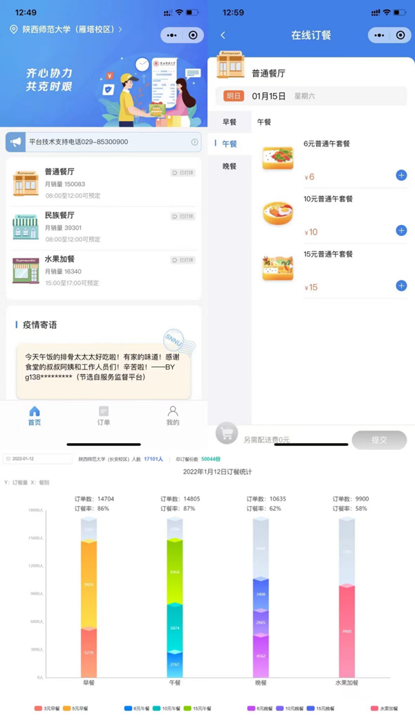 在疫情防控常态化趋势下,陕西师范大学积极落实防疫工作指示要求,瞄准服务、精准出击,充分发挥信息化手段的有力作用,后勤服务保障质量优、效率高。此外,由陕西师范大学自主研发的“云享餐”订餐平台陆续为吉林大学、长春工业大学、长春大学等多所高校提供了信息化支持服务,为助力兄弟院校的疫情防控发挥了积极的作用。