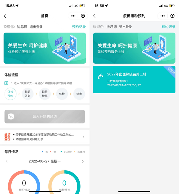 (体检预约及疫苗预约界面)