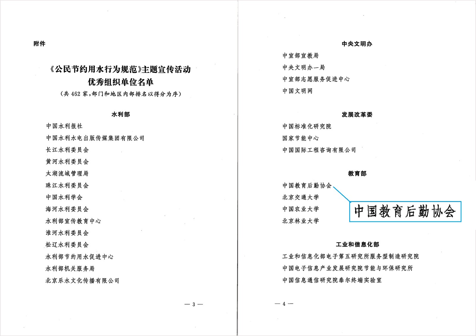 近日,水利部办公厅发文通报表扬《公民节约用水行为规范》(以下简称《行为规范》)主题宣传活动优秀组织单位,中国教育后勤协会获此殊荣。