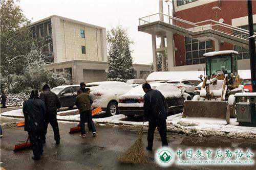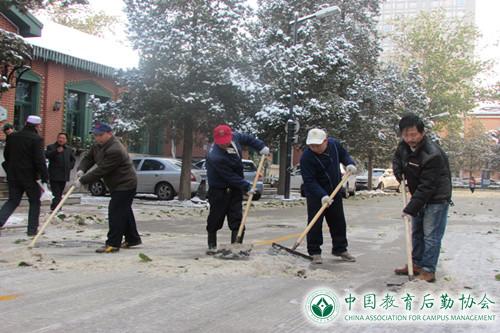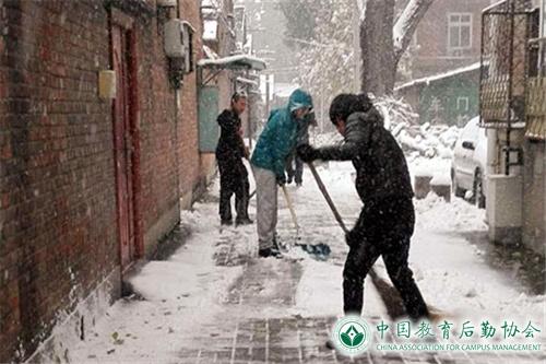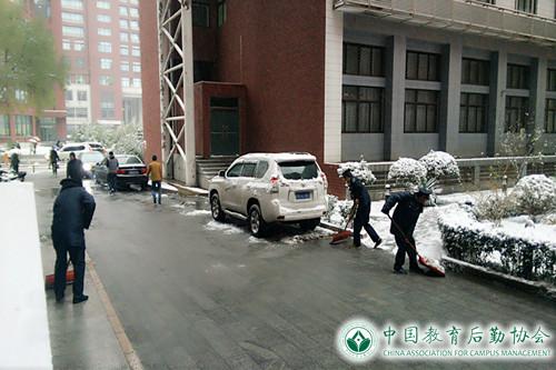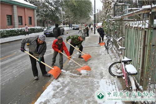 22日下午1时,老校区综合管理办公室组成20余人的扫雪应急小组,合理有序地分别对大门口、花园、主路、辅路及甬路进行清扫。扫完又沿各主干道进行撒盐,防止结冰。下午降雪量虽减小,但并未停止,加上夜间气温较低,23日早上地面结成一层薄冰。早七时,继续扫雪铲冰工作,8点半左右,主要道路路面冰雪已清除,保障了院区住户出行安全。