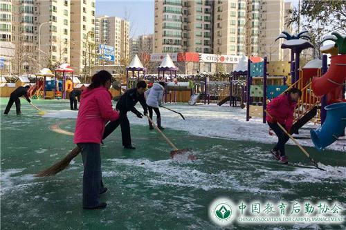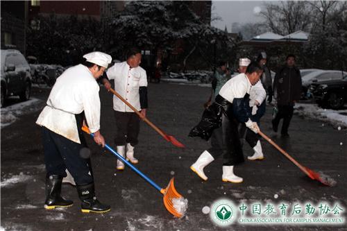 餐饮管理部于22日下午启动扫雪铲冰应急处置预案,开展积雪清扫工作,并遍撒融雪剂,避免晚上结冰。23日清晨,各食堂、餐厅继续组织人力,加大力度清扫积雪,由食堂主任带队,提前了上班时间,历时1.5小时左右,将三包区域的积雪清扫干净。