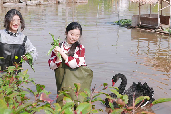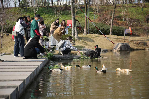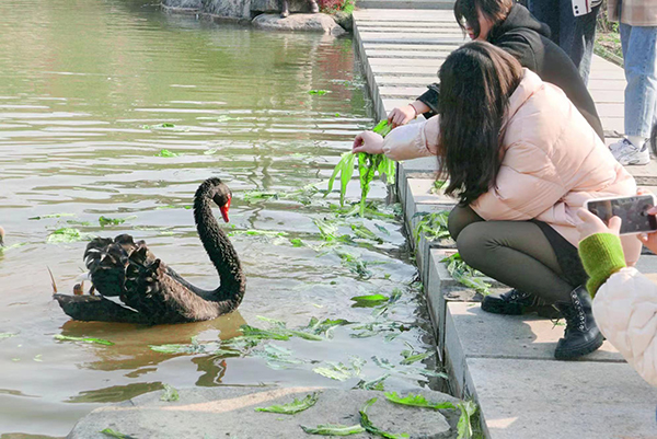 天鹅秀后,同学们一起与“天鹅爸爸”倪小建一起喂天鹅,天鹅妈妈带着刚出生不久的两小只也游到湖边吃起了同学们喂它们爱吃的油菜,天鹅爸爸为了保护小天鹅则进入了防御状态,耸着翅膀盯着同学们,但时不时也会突然啄上一口同学们手中的菜叶,湖中的三对野鸭也前来凑热闹,加入吃货团队。天鹅爸爸特别喜欢跟着倪师傅,倪师傅走到哪儿就跟到哪儿,一不留神倪师傅走到了湖对岸,天鹅爸爸回过神后立马展翅飞向倪师傅,快到时一个漂亮的急刹车停在岸边,又恢复了它高傲的姿态。倪师傅还为同学们准备了下水裤,让同学们体验了一把近距离在湖水中喂天鹅的互动。