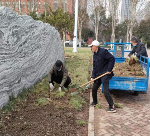 新乡医学院后勤保障部物业服务中心抓住春季园林植物绿化养护黄金期,有序开展树木整形修剪、绿化垃圾清理、松土除草施肥、花坛草坪补栽等养护管理工作,为全年园林养护打好基础,提升美丽新医形象。