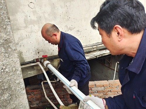 经水电工对漏水处破开地面进行勘察,发现是50毫米口径供水管因年代久远,锈蚀破裂导致漏水。经现场研究,决定新装PVC管更换原管道。因时值用水高峰期,物业服务部一边应急采购管件,一边进行安装前期准备工作。为尽快恢复供水,中午12点,定海校区水电组开始抢修,首先将破裂水管与主供水管接口处换上阀门,然后再从阀门处新接PVC水管。维修中,恰逢天公不做美,天空中突然飘起细雨,为尽快恢复正常供水,水电组冒雨加班加点作业。至下午14点,历时2个小时,水电组完成水管抢修工作,保证了第二食堂及商铺的用水。据测算,如未及时对此水管进行维修,每日将浪费水300余吨。