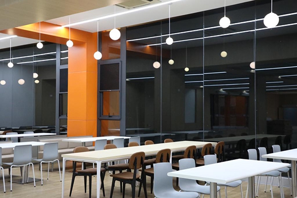 改造后的集贤食堂突破传统的大伙食堂设计理念,融入色彩感、时尚感、现代感元素和“集贤”文化元素,实现课堂、食堂、讲堂三合一,满足学生就餐、学习、会议、研讨、社团活动等多种功能需求。改造后的集贤食堂大厅宽敞明亮,以亮橙色为主基调,具有温暖、欢快、健康、热情的独有风格和气质。大厅桌椅选用明快简洁的配色,以不同风格的桌椅和灯饰实现快餐区、卡座区、休闲区的功能分区,整体环境现代、清新而富有文化气息。