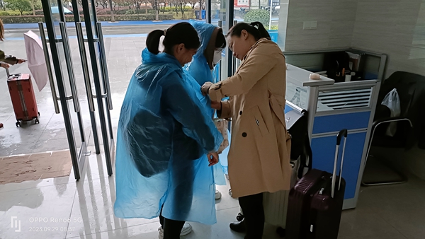中秋佳节,暖心一幕,宿管老师为2023级“小萌新”整理穿戴雨衣。9月29日,农历八月十五,中国传统节日“中秋节”,室外阴雨绵绵,略有些凉意,但夏荷楼学生公寓2号门值班的宿管老师与2023级“小萌新”的暖心一幕,让笔者感到暖暖的、很贴心。“同学,这会儿雨下得比较大,穿好雨衣,我来帮你整理一下。”宿管老师赵启永暖心地和离校回家的学生说着,动作麻利的一边整理雨衣、一边帮助她扣好雨衣的按扣。这一幕,感动着我,也感动着离校回家的学生。“谢谢阿姨、谢谢老师!祝你们节日快乐!”我们彼此互致问候。