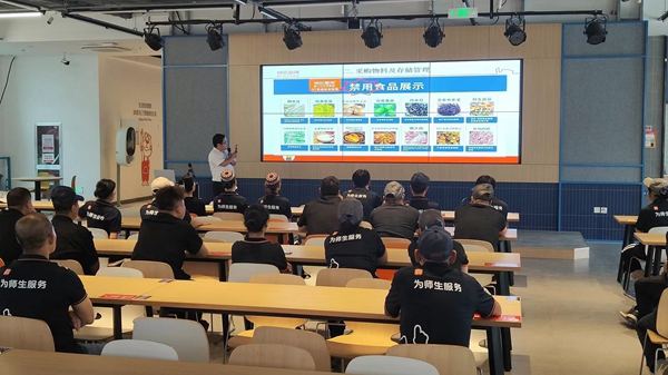 在培训阶段,周语明强调,食堂安全是学校稳定的基础,大家一定要提高政治站位,要强化食品安全和生产安全防范意识,要认真学习贯彻上级各类文件精神,全面排查食堂安全隐患,扎实做好学校的食堂安全工作,共同营造安全、健康、和谐的校园环境。随后,食堂对所有餐饮从业人员进行了食品安全和生产安全知识培训。