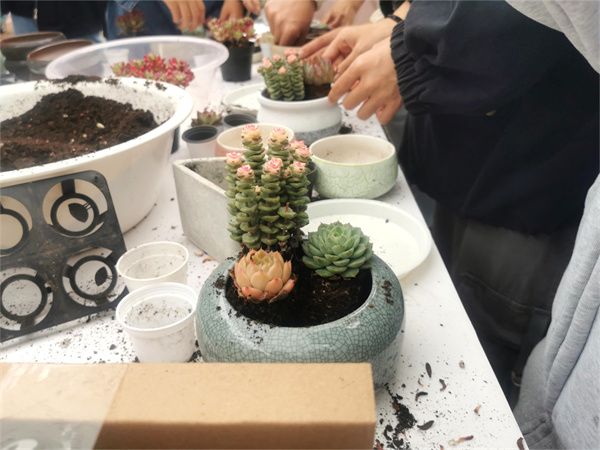 活动现场,物业服务部苗圃主管王敏向同学们介绍了常见的室内盆栽植物和多肉植物,对多肉植物的种植要点进行了详细讲解。宣讲结束后,同学们在后勤物业的苗圃园亲手进行多肉盆栽的种植。