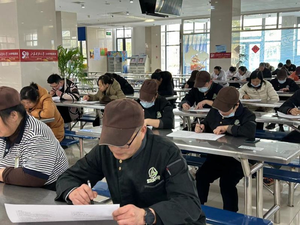 为进一步强化食堂从业人员安全生产责任意识,提升餐饮服务保障能力,确保师生“舌尖安全”,11月30日下午,江苏科技大学饮服中心在梦溪校区、长山校区同时开展安全生产知识竞赛活动,食堂厨师、保管员、面食工、米饭工、特色风味档口等重点岗位,共150余人参加了本次活动。活动分别由饮服中心副主任许荣才、顾章近主持。