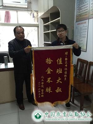 3月19日12点40分左右,江苏大学后勤服务集团公寓D区4C栋值班员陈大定巡查楼栋时,在楼梯口捡到一个钱包,当时,陈大定同志只有一个念头,钱包在楼栋内应该是学生丢的,要尽快将钱包交到丢失的学生手中,免得学生着急。他为了尽快找到失主,便打开钱包寻找身份证件,发现钱包内有现金1000多元和多张银行卡,幸好,钱包内放着一张身份证。陈大定同志通过核对楼内学生花名册,发现钱包主人正是住在753宿舍的管泽群同学。他随即来到753宿舍,经核实无误后将钱包归还给了管泽群同学。接过失而复得的钱包,管泽群同学显得意外而又惊喜,连连表示感谢。3月22日,管泽群为表达心中感激之情,将一面“拾金不昧”的锦旗送到了值班员陈大定同志手中。