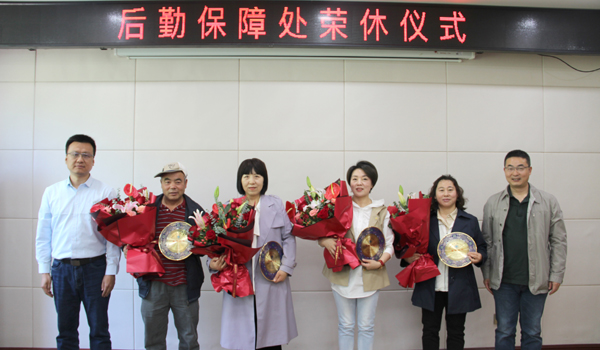 后勤党政领导为退休职工献上鲜花、颁发荣休纪念盘并合影留念。