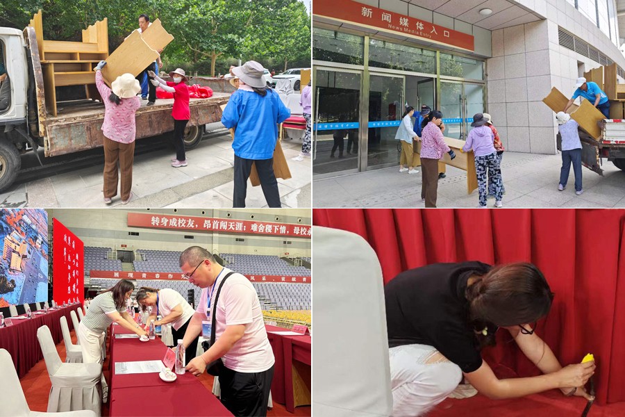 19日,完成主会场桌椅、演讲台搬运工作;20日,完成主席台布置,摆放桌子27张、座椅30把,铺设桌布等工作;典礼当天,工作人员早6点到达会场,对主席台桌椅进行微调平整,主席台及周边卫生维护,安排专人辅助典礼现场的扩音服务;同时,分会场工作也在有条不紊进行;典礼结束,相关人员立即进行各项收尾工作,有序清理现场。