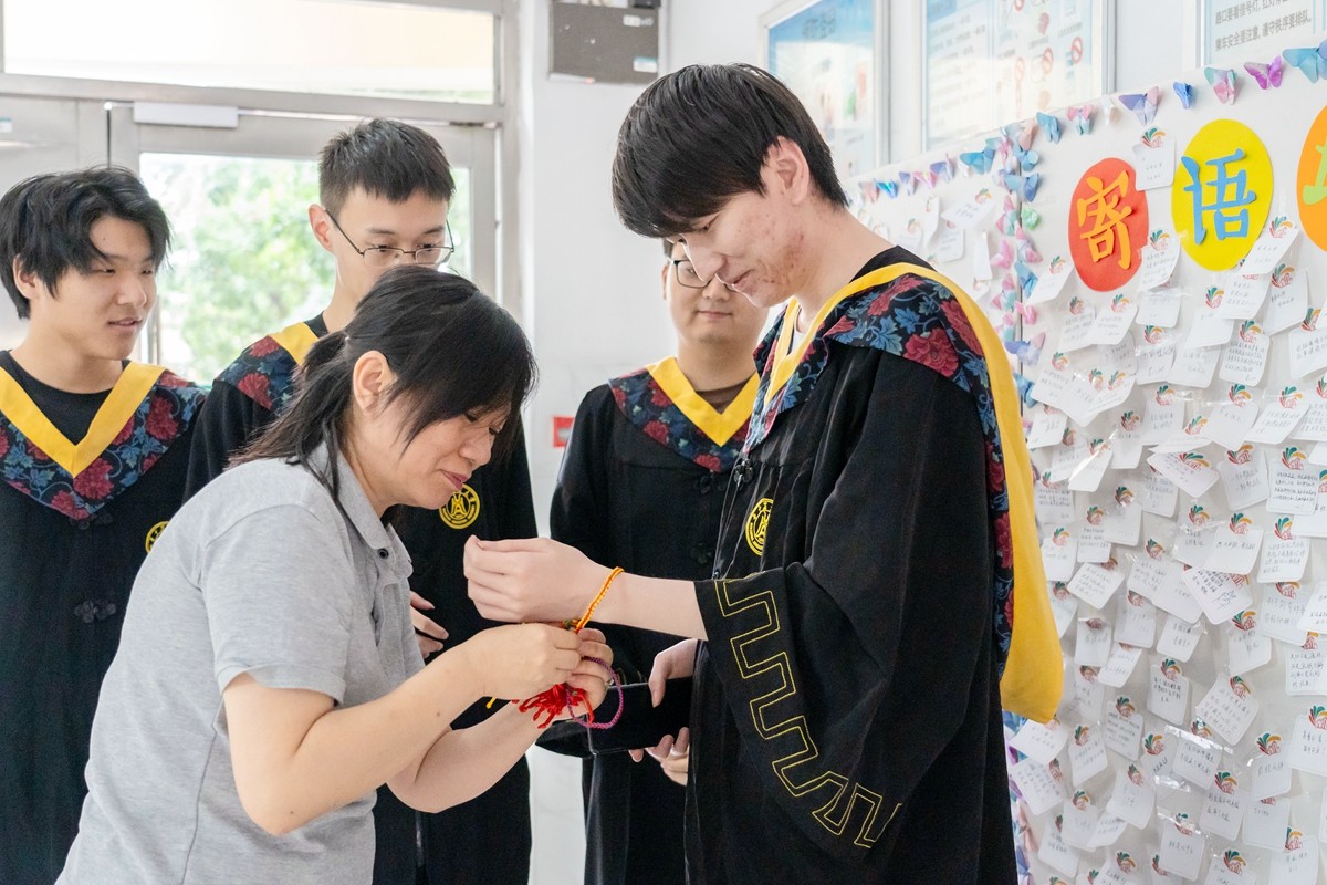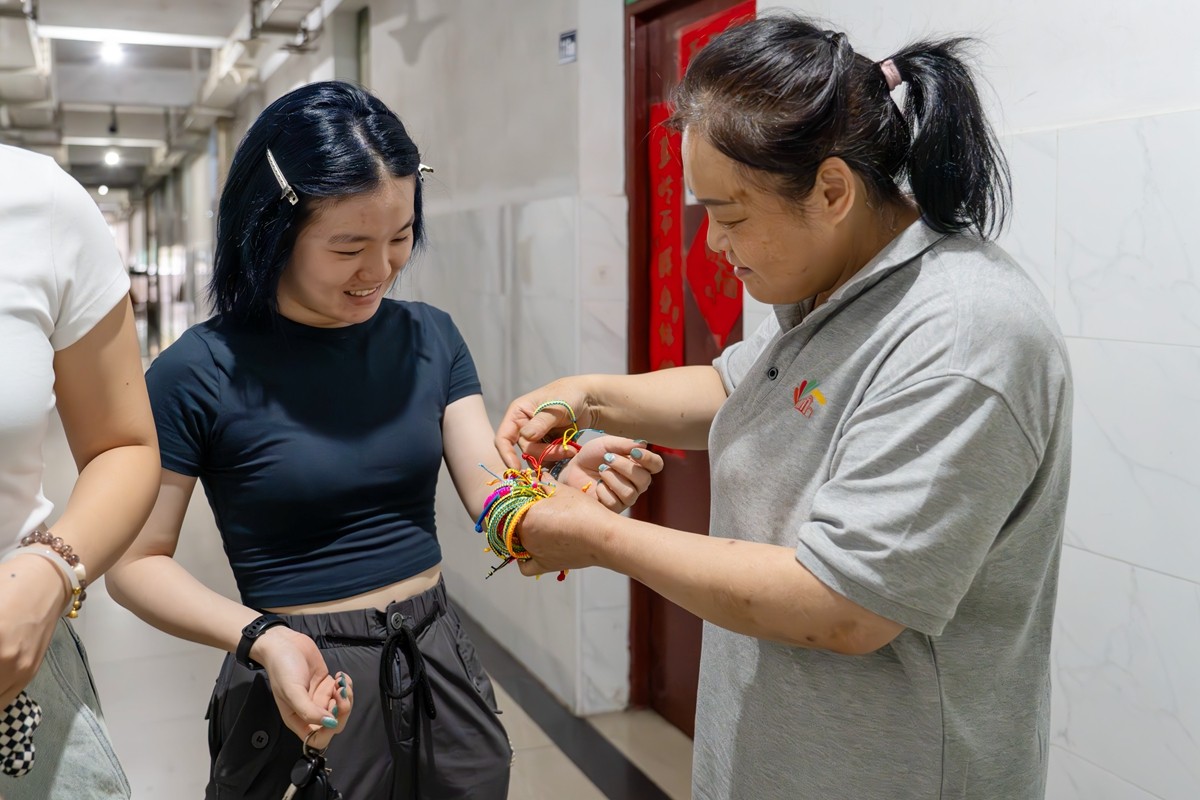 宿管阿姨为毕业生系上她们亲手制作的五色手绳,祝同学们前程似锦(韩鑫垚 摄)