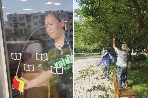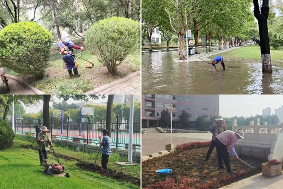 绿化环境部做好雨季内除草灭荒工作;修剪草坪、模纹、球型灌木,楼宇周边下垂树枝。集中清理路面、绿地杂草,做好开学前路面、广场环境卫生保洁;重点区域种植一串红、地被石竹的等草花,更新种植生长不良竹子;修剪清理12号教学楼内庭院树木,做好修读园施工前准备。