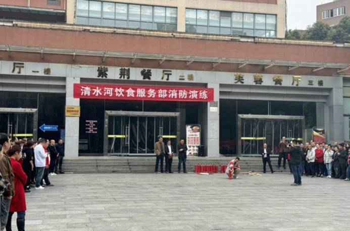 饮食服务中心演练邀请学校保卫处副处长钟声、消防科科长徐志海、科员李鑫、杨峰进行指导,为清水河校区、沙河校区全体员工详细讲解灭火器、灭火毯等消防用具的使用方法、操作要点和火灾发生后的应急救援流程,通过简明扼要的讲授,为员工上了一堂消防知识课。演练还同步进行了灾情现场模拟,参与员工按照消防责任分工,拨打火警电话报送险情,组织人员有序撤离,使用灭火器、锅盖和灭火毯对着火点进行扑灭,在实践操作中进一步巩固消防知识,强化救灾意识。
