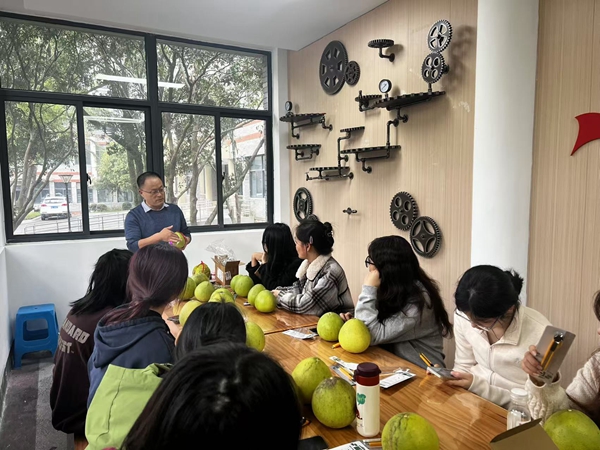 仪式过后,方立银组织现场学生在工匠室开展了柚子灯制作课。同学们在方老师的指导下采柚子、切柚子、挖果肉、设计图案、装彩灯,体验劳动和手工制作的乐趣,并亲手将制作好的柚子灯成品装饰在“匠心缘”工作室。