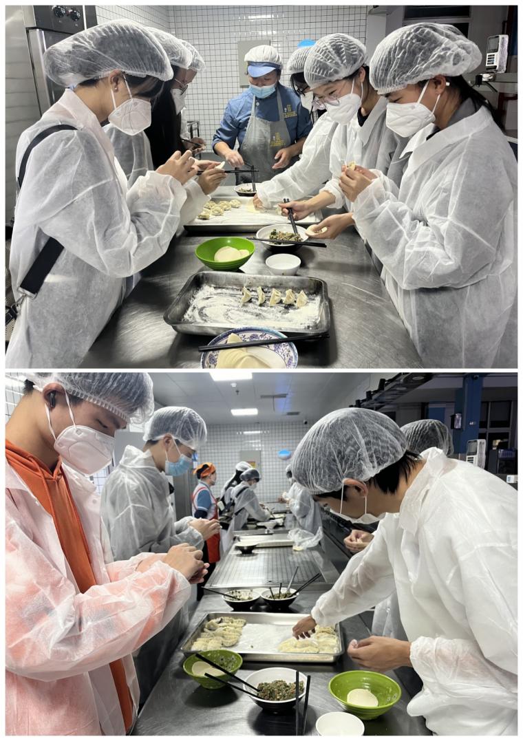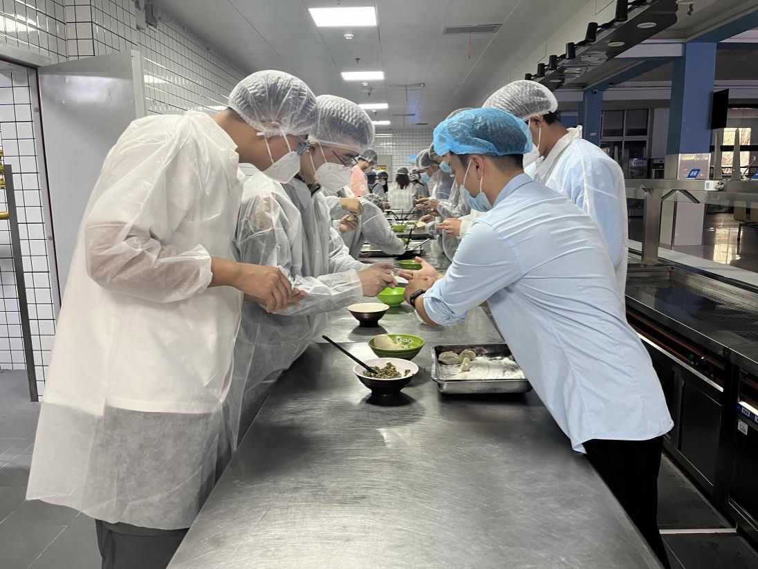 海洋学院赵赫老师、学工组李盼盼老师与20名学生围聚一团,在食堂师傅们的耐心指导下,兴致勃勃学习包饺子。饺子皮在指尖跳跃,巧手翻飞间,一个个圆滚滚的饺子悄然成型。