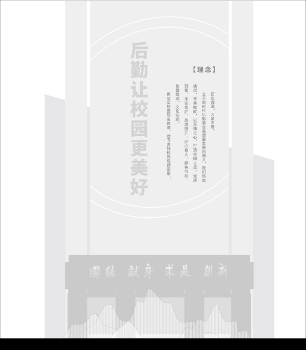 立于新时代后勤工作高质量发展的潮头,我们热血横槊,青春赋歌,以至臻之心,打造校园之美。党建领航,平安常驻,品质提升,匠心育人,绿色节能,智慧驱动,文化沁润。