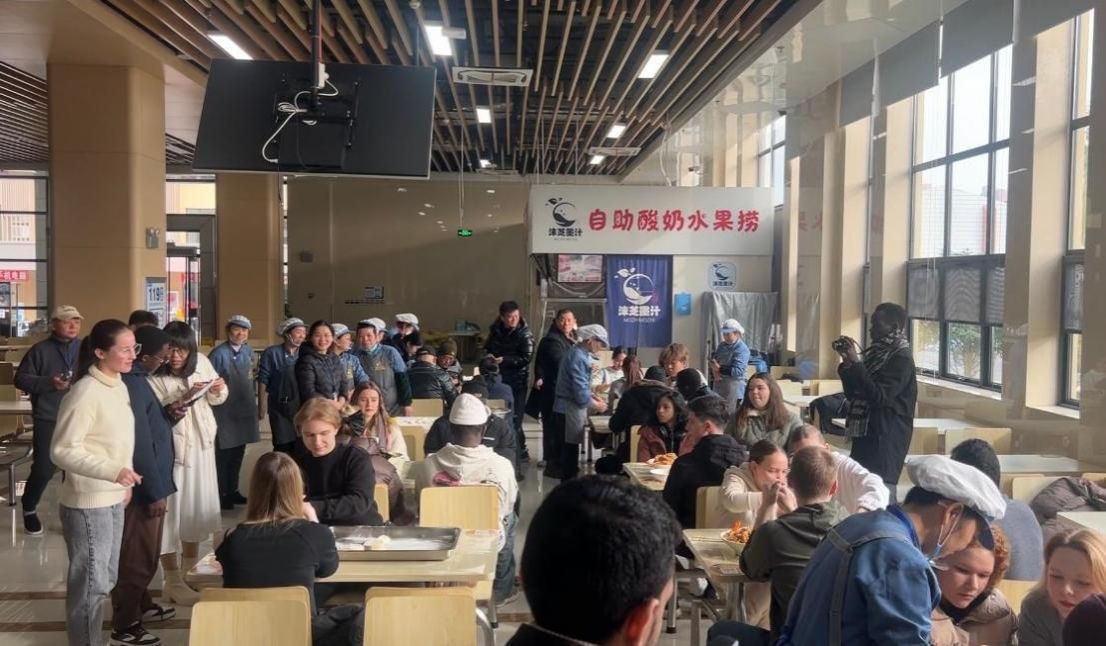 党员同志们也纷纷加入其中,手把手耐心教授同学们如何揉面、如何擀皮、如何捏褶,虽然语言不通,但这一刻大家的心与心连在一起,消融了文化的隔阂。大家忙得不亦乐乎,场面热闹而温馨;他们虽然手法生疏,但那份对美食的热爱和对文化的尊重却溢于言表。