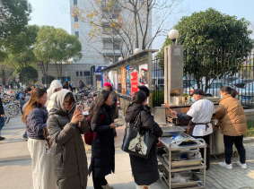 桐乡校区工作人员在食堂门口赠送定胜糕、烤肠、手工制品等小礼物,同学们还能与小熊拍照打卡,也是寓意满满。