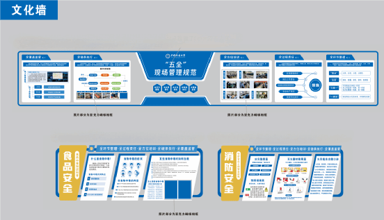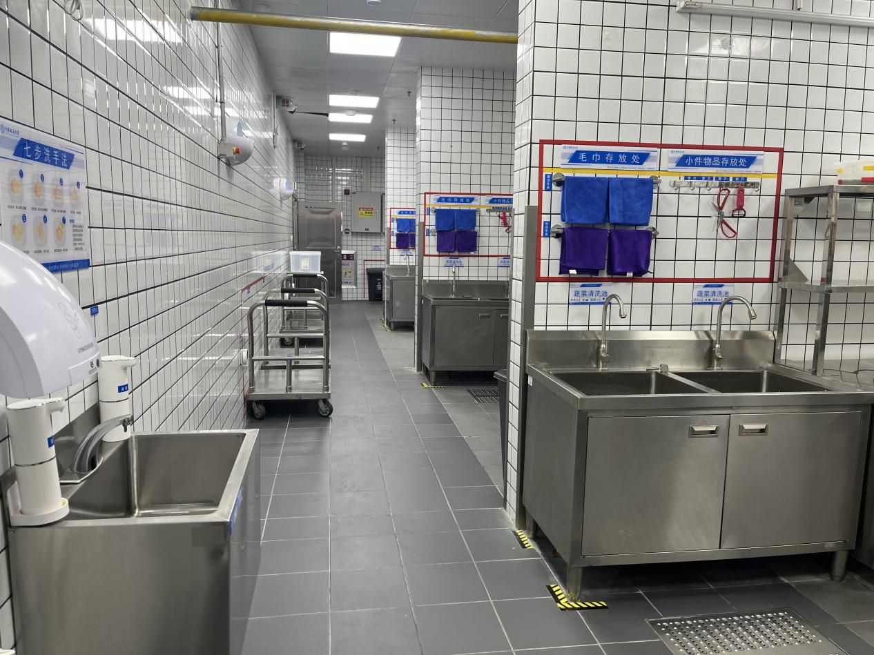 专班围绕“无水化”厨房管理需求,设计包含五全文化墙、安全警示栏、设备操作责任卡、色标管理分区标识、文件存放处、标准化提示牌等六大类视觉标识模板,形成可复制推广的标准化视觉体系。专班利用北区食堂作为试点,完成794个标识标牌的上墙安装,覆盖后厨操作区、储存区及公共区,实现“流程可视化、操作规范化、标识统一化”。以北区食堂为标准化建设的参考样板,逐步推广至我校各食堂,全面提升饮食服务品质。