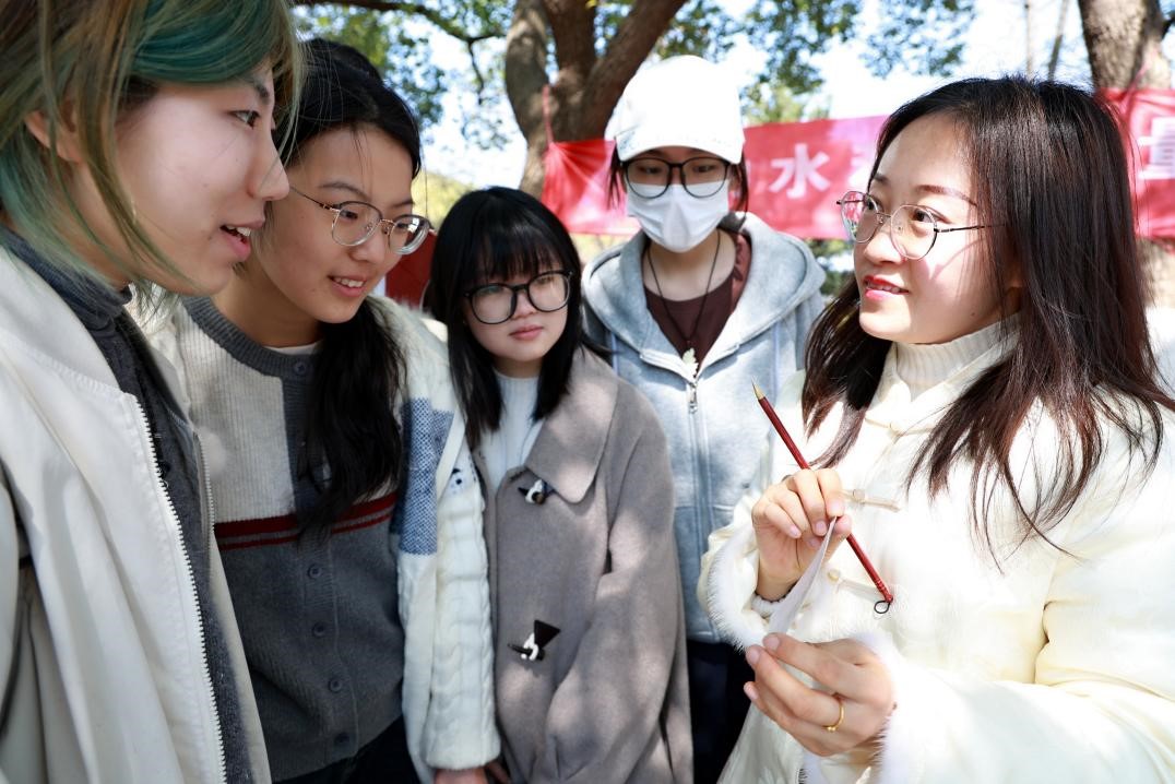 水润万物,惜之方久。在传统文化展示区,后勤处(集团)书法爱好者赵菁以“水”为主题,将节水理念融入古典诗词创作中,并指导同学们共同书写书法作品。同学们手执毛笔,感受墨香,纷纷感慨:“节水不仅是行动,更是一种文化的传承。”