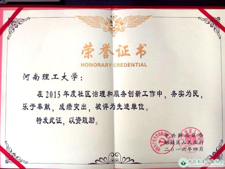 5月11日,由中共焦作市解放区委、解放区人民政府主办的“解放区社区治理和服务创新暨美丽楼院创建工作推进大会”在焦作市会务中心圆形会议大厅召开,河南理工大学被评为“解放区2015年度治理和服务创新工作”先进单位,河南理工大学后勤管理处(集团)学苑社区大北一号院、大北二号院、小北院、东南东院、东南西院五个楼院被授予三星级“美丽楼院”,新大北院被授予四星级“美丽楼院”荣誉称号。