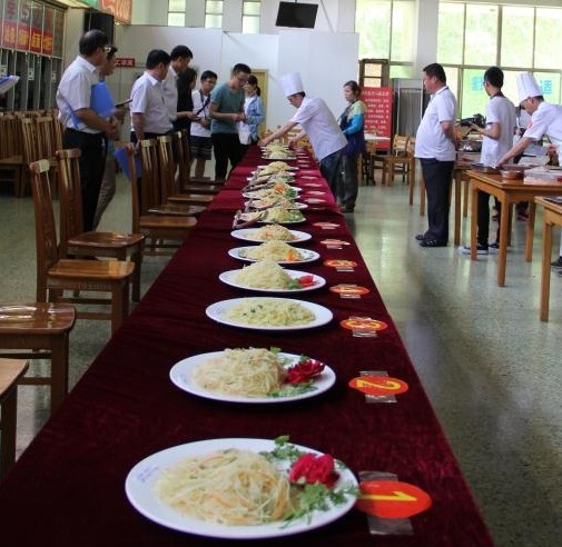 来自东、西校区学生餐厅共十九名厨艺高手参加本次比赛,比赛由规定菜制作和创新菜制作两个环节组成,规定菜为醋溜土豆丝,主要考验选手的色、香、味、汁芡、火候、刀工等方面厨艺,创新菜则是要求选手们秀出创意、拿出绝活。