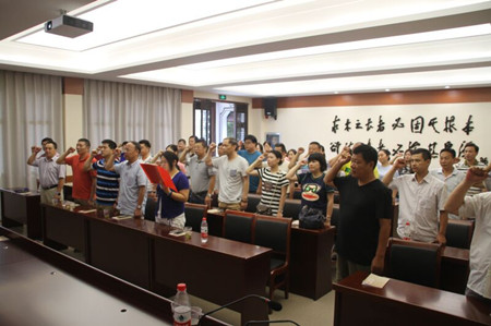 参加活动的全体党员高举右拳,面向党旗,重温了入党宣誓词。