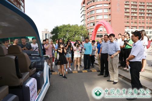 (后勤集团总经理林建荣为刘伟校长介绍行李运送专用车服务及使用情况)