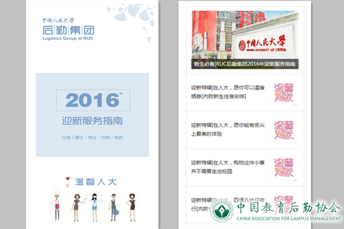 “温馨人大”官微平台推送迎新服务指南。在2015版后勤集团迎新服务指南的基础上,重新设计版面并修订服务指南内容,提前将指南折页册分发到各个学院,方便新生在报道时领取。服务指南高度浓缩、全面展示校园生活的各个方面。同时,利用“温馨人大”微信公众号发布迎新服务指南及《迎新特辑》系列推送,从衣食住行各个方面详细介绍人大后勤相关服务内容,帮助新生迅速适应新的学习生活环境。