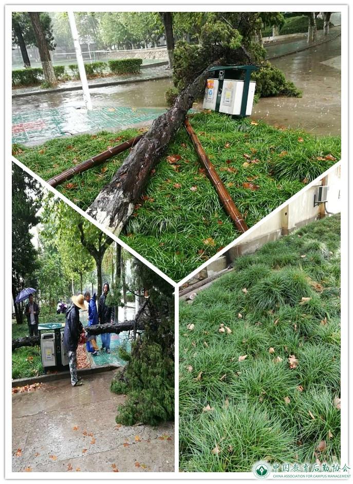 9月16日,受强台风和暴雨的影响,江苏大学高知餐厅门口柏树发生倒伏,正值师生用餐高峰期,给进出就餐的师生带来了安全隐患。