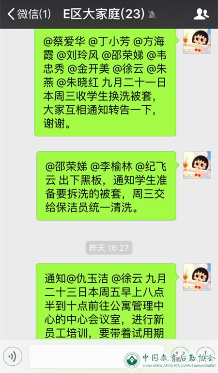 微信作为及时沟通交流的重要平台,正迅速影响和改变人们的工作和生活。为拓宽和畅通员工之间的沟通交流渠道,近日,江苏大学后勤服务集团公寓管理中心E区管理部创建了“E区大家庭”的微信群交流平台,随时随地解决实际遇到的难题和关联工作,提高了沟通的效率,增加了沟通的趣味。
