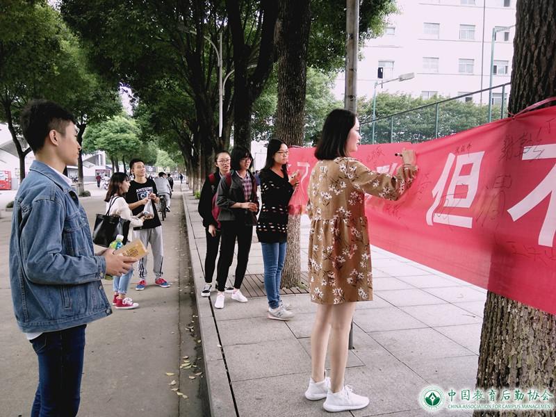 东校区勤奋路“你可以吃我,但你不可以抛弃我”的横幅非常醒目,校伙管会的同学们用午餐时间向过往的师生进行世界粮食日的宣传,通过活动扩大世界粮食日在同学们之间的影响,宣传爱粮节粮和健康知识。古往今来"民以食为天",粮食在整个国民经济中始终具有不可替代的基础地位。粮食已成为各个国家重点监控及首要解决的问题。作为当代大学生,必当积极响应各种爱粮节粮的活动号召,真正达到"爱惜粮食"的要求。在校园中,大学生们不为生存烦恼,不为饿肚子而苦恼,但要有忧患意识,为贫穷落后地区着想,将节粮爱粮的思想贯彻落实到同学们的日常生活中。如果人人都从自身做起,从身边做起,杜绝粮食浪费现象是指日可待的!让我们从身边的每一次就餐做起,做一名节约宣传员。