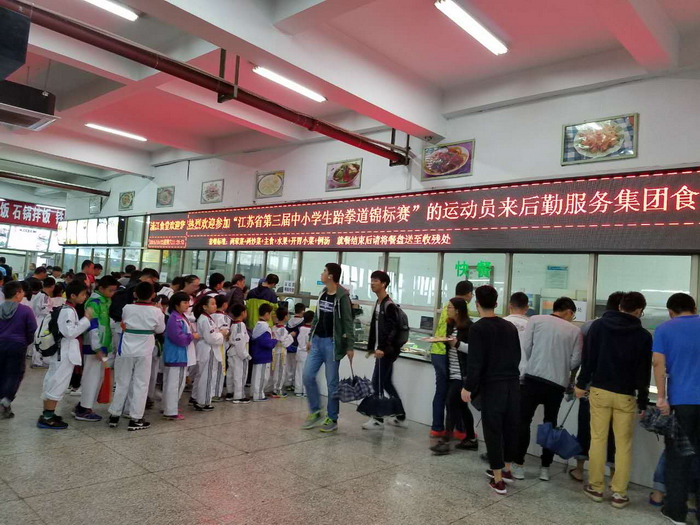 10月21日至23日,江苏省第三届中小学跆拳道锦标赛在南京工业大学体育馆举行,来自全省中小学九十多个代表队的运动员、教练员、裁判员和领队近1000人参加了比赛。南京工业大学后勤服务集团浦江一食堂以优质的服务,圆满完成了参赛人员的餐饮服务保障任务。