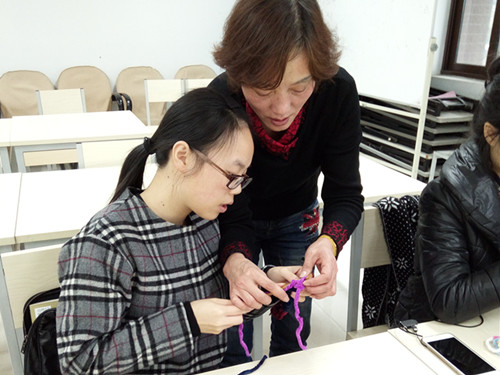 编织课上,先由指导老师进行现场演示,同学们跟着老师的手法一步一步学,对于手法复杂的步骤老师耐心地手把手指导。来自教育学院的梅雨欣同学说:“编织可是门技术活,多亏有老师的细心指导,不然我们手里的毛线就要散成乱糟糟的一坨了!”