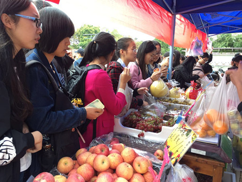 活动现场,人潮里三层外三层。葡萄柚、红提、香蕉、猕猴桃等十几个品种的新鲜水果平价售卖吸引了大批师生竞相购买。“哇,红提4.5元一斤,橙子10元6只,我买到了,感觉好合算,我要回去告诉室友让她们也多买点。”一位女生挤出人群兴奋地告诉记者。