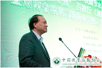 湖南省教育厅财建处副处长刘积成在会上致辞。他对本次大会的召开表示了热烈的祝贺,并对远道而来的领导及同仁表示感谢。刘处长对“校园节水•智慧管理•安全供水‘最后一公里’百校行”交流研讨会的意义表示了肯定,并感谢中国教育后勤协会能将该会议带到湖南,他相信该活动定能有利促进湖南高校后勤供水情况的改革。他指出,党的十八届五中全会提出了创新、绿色、开放、共享、协调五大发展观念,明确倡导全面节约和高效利用资源的理念,而高校作为社会文明和科技创新的重要阵地,需要认真贯彻党中央和国务院的方针政策,抓好校园节水、安全用水、绿色生产、校园建设和水电制度等管理工作并推进水电节能监管平台的建设。